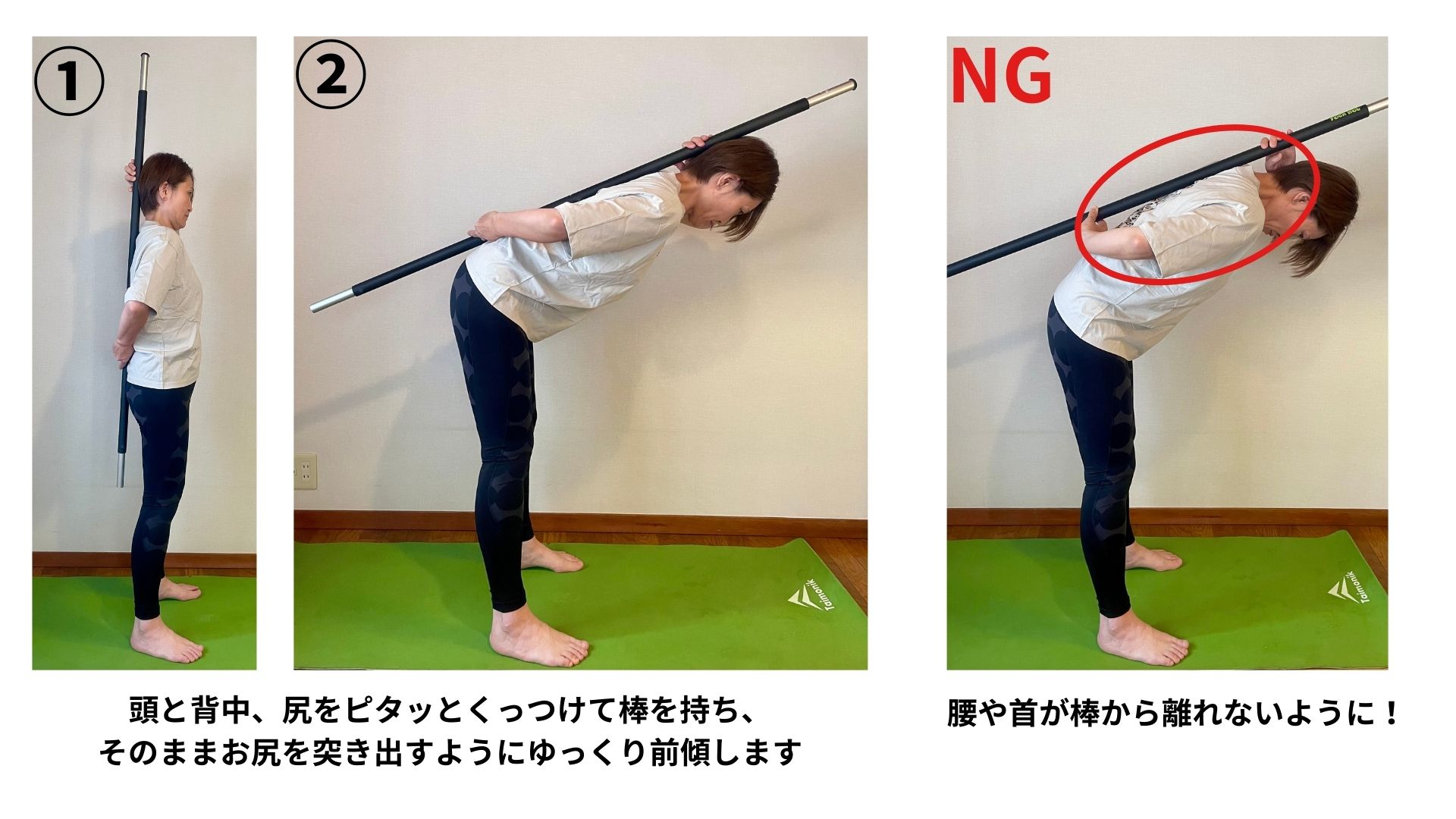 ヒップヒンジの練習やお尻を意識したスクワットなどで、